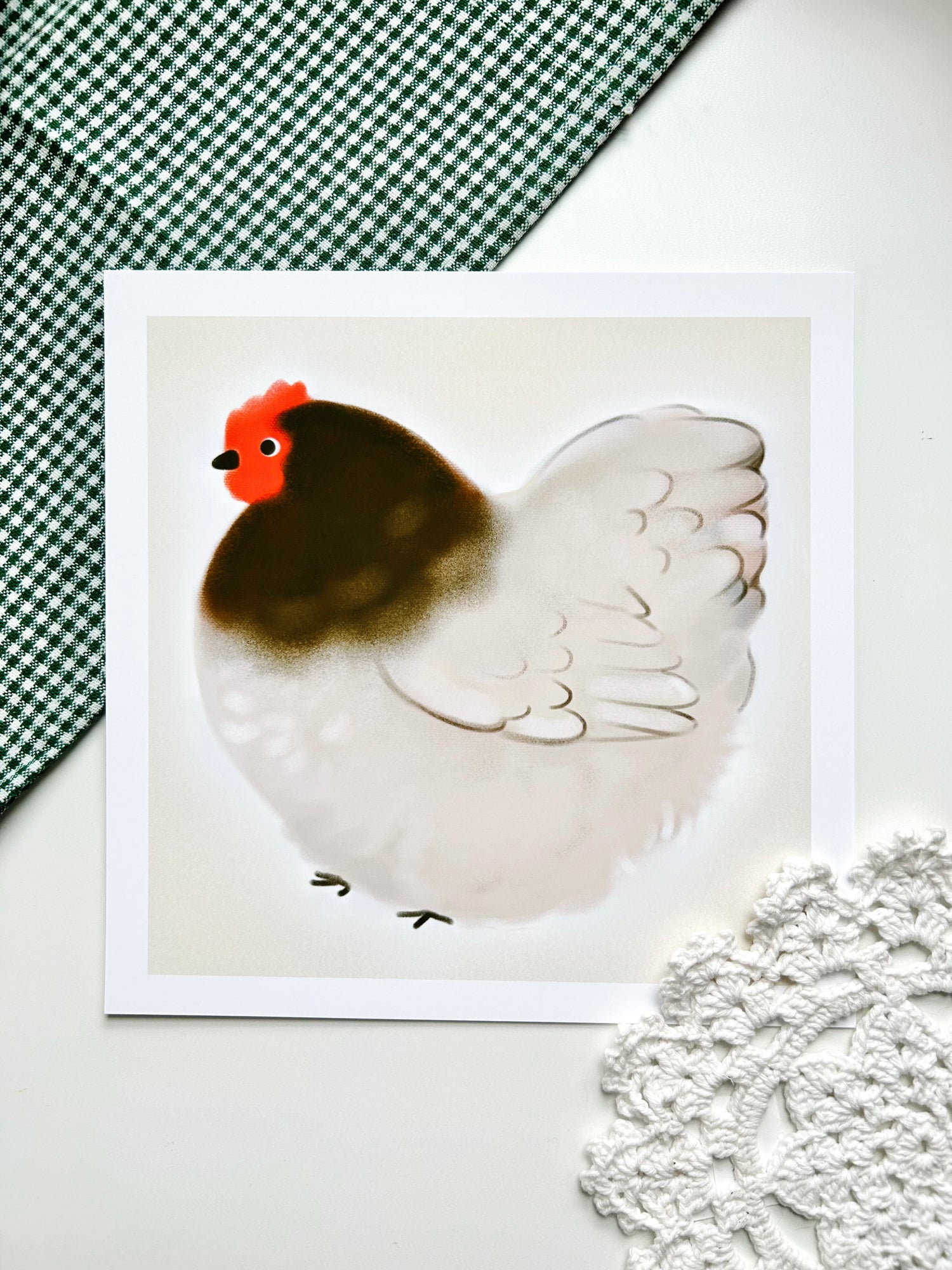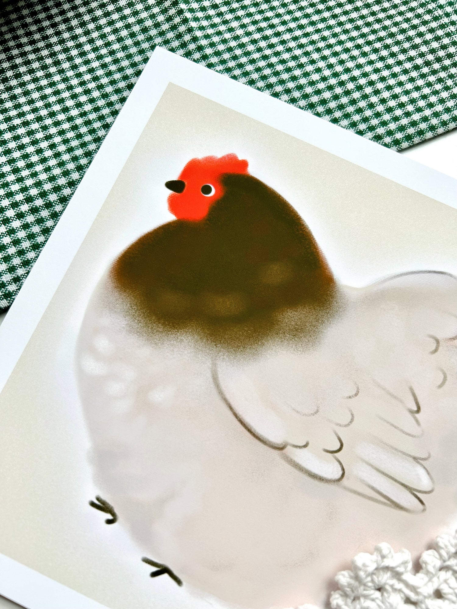 This artwork is a digital illustration of a chicken, it has a fuzzy simple look to it and is 8 x 8 inches big