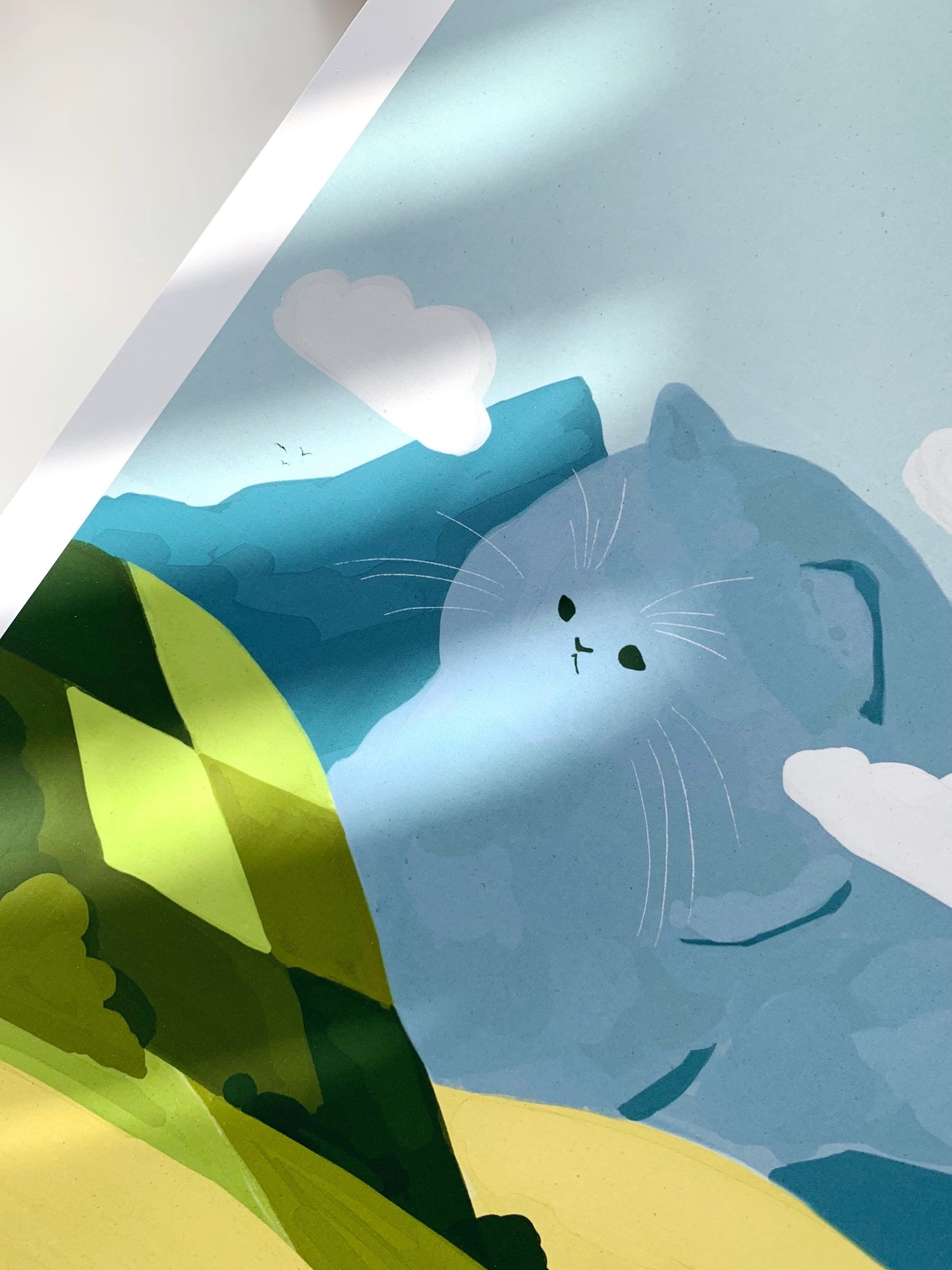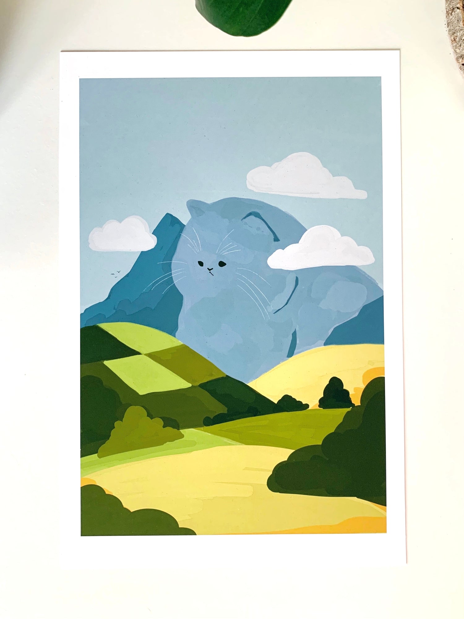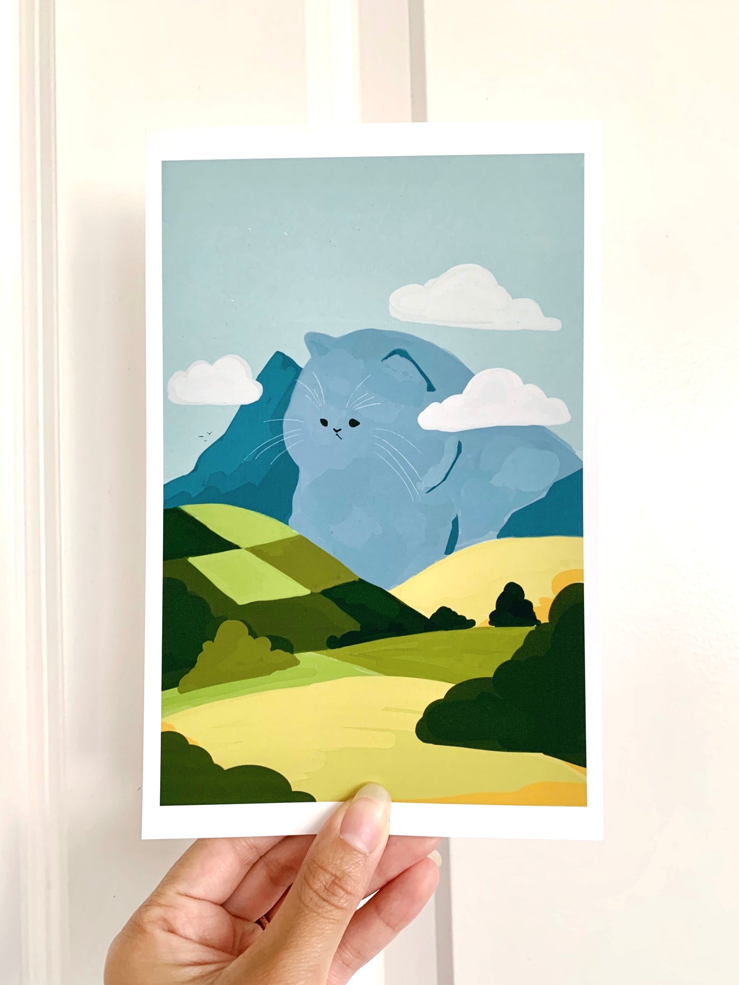 Art was printed on a high quality matte and thick photo paper (cotton rag for the small 5.5x8.5 inch print) and features a vibrant green and blue art print of a cat mountain, Meowtain.