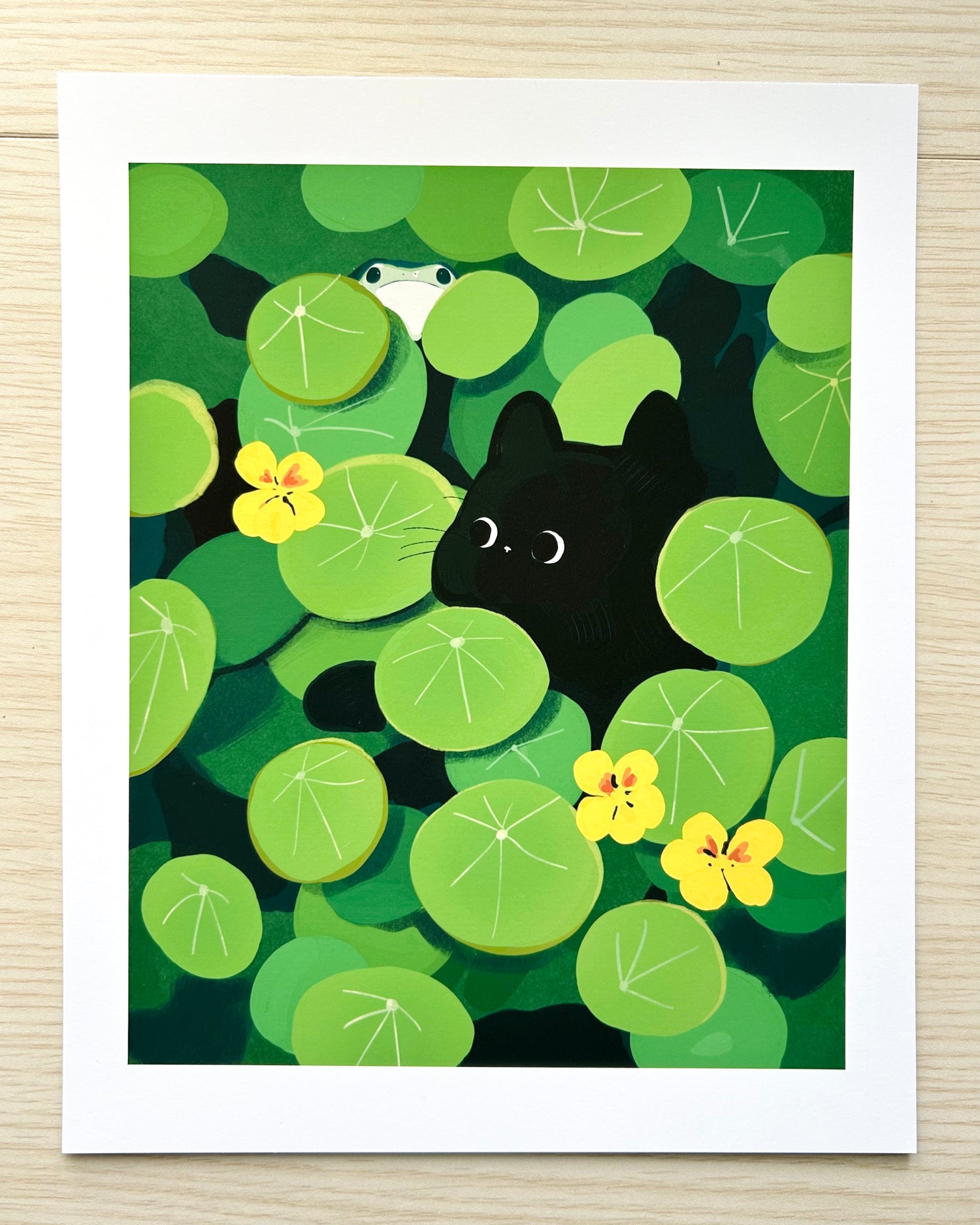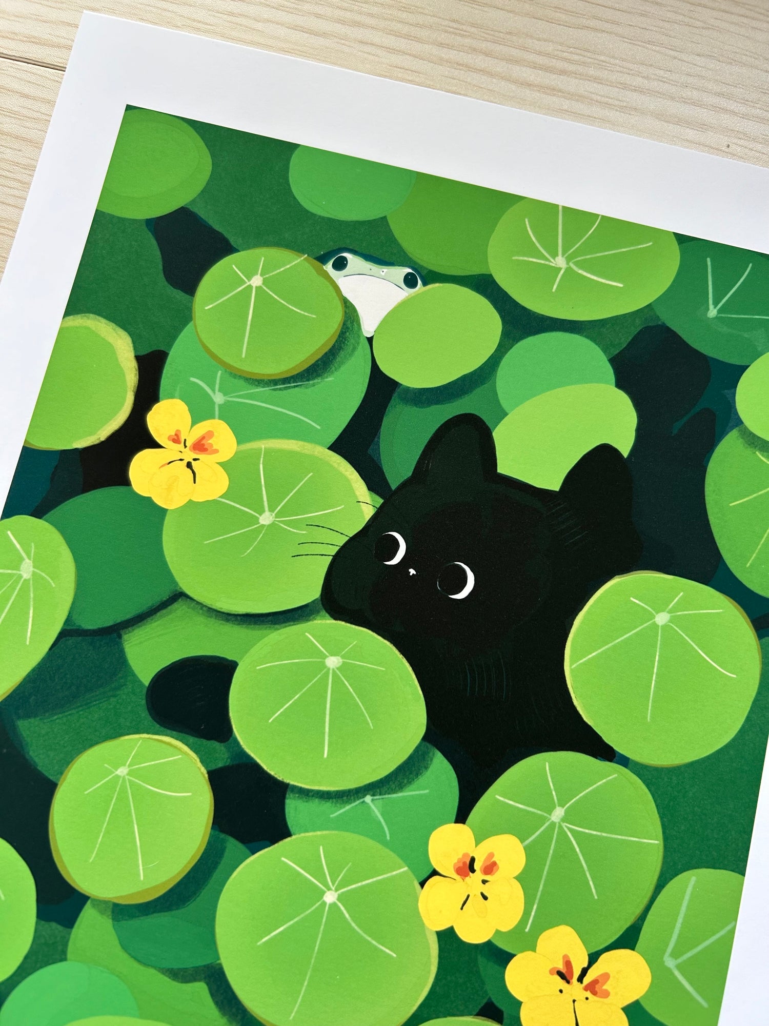 This artwork was printing on a thick and matte photo paper and features a black cat looking for a frog around heavy leaves with a frog peeking through the leaves.