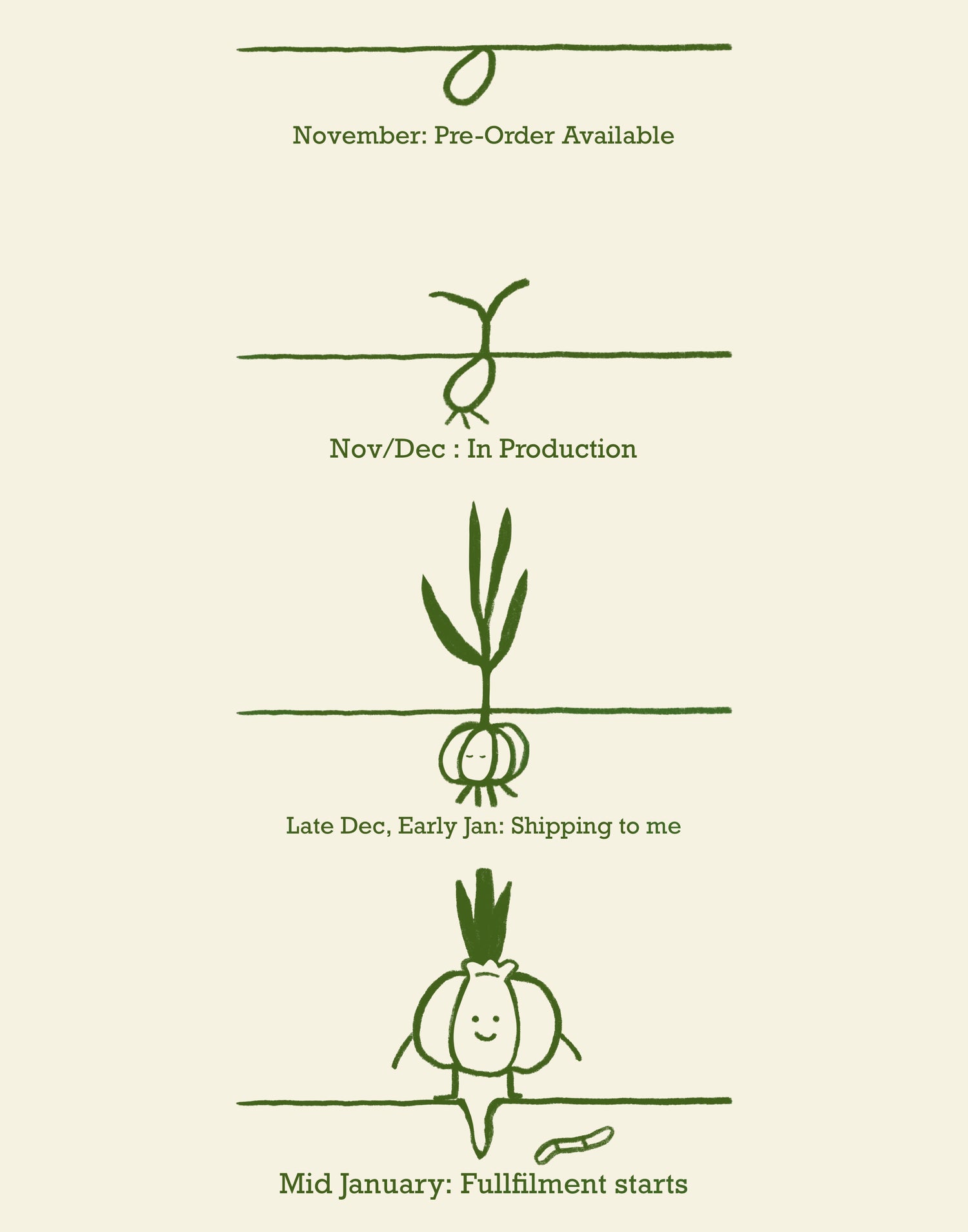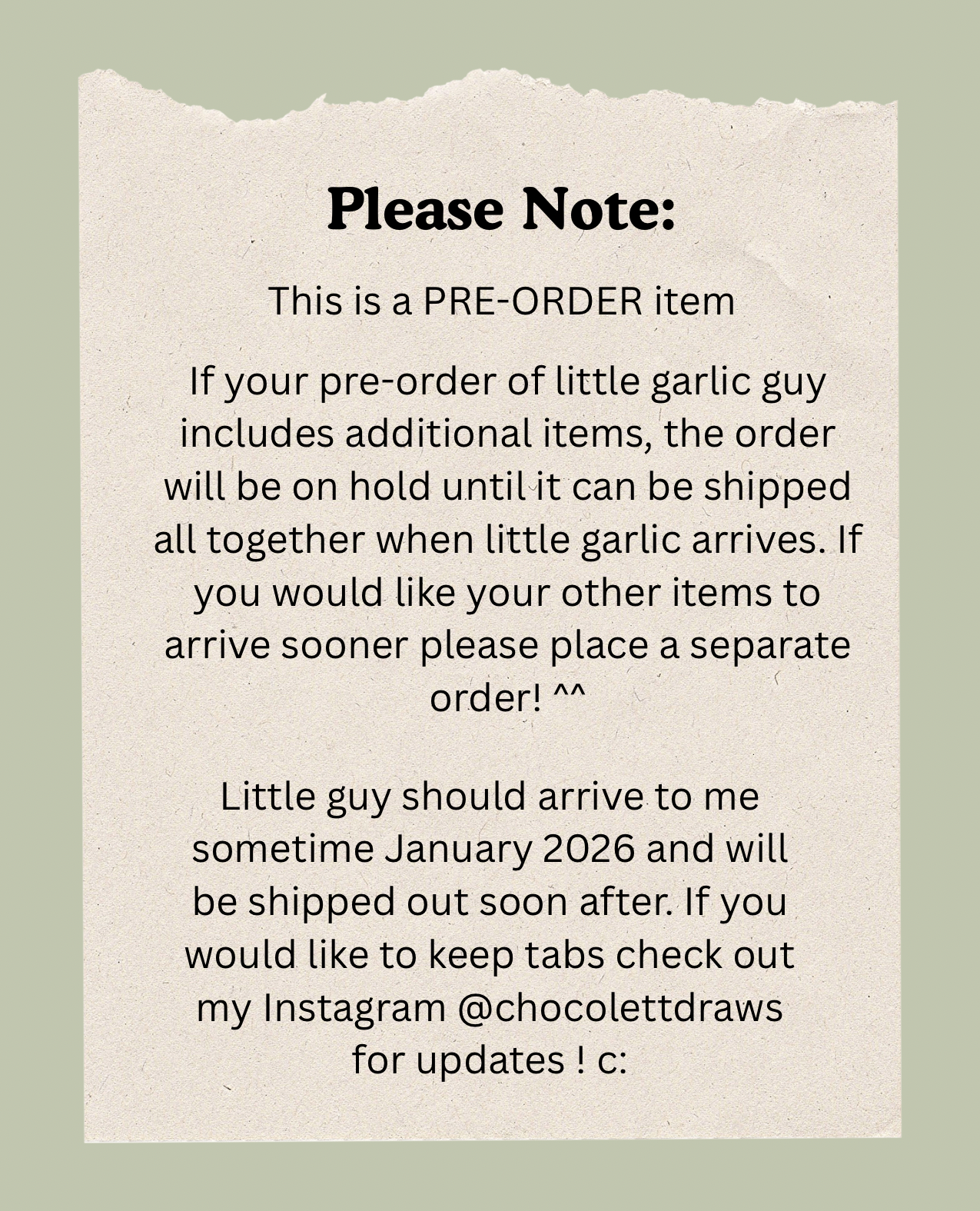 Pre-order Little Garlic Guy is approximately 7 inches from top of the keychain clasp to the lil string legs, but the garlic itself is about 3.5 x 3.5 x 3.5 inches ! He is still in production and should be delivered to me around January!