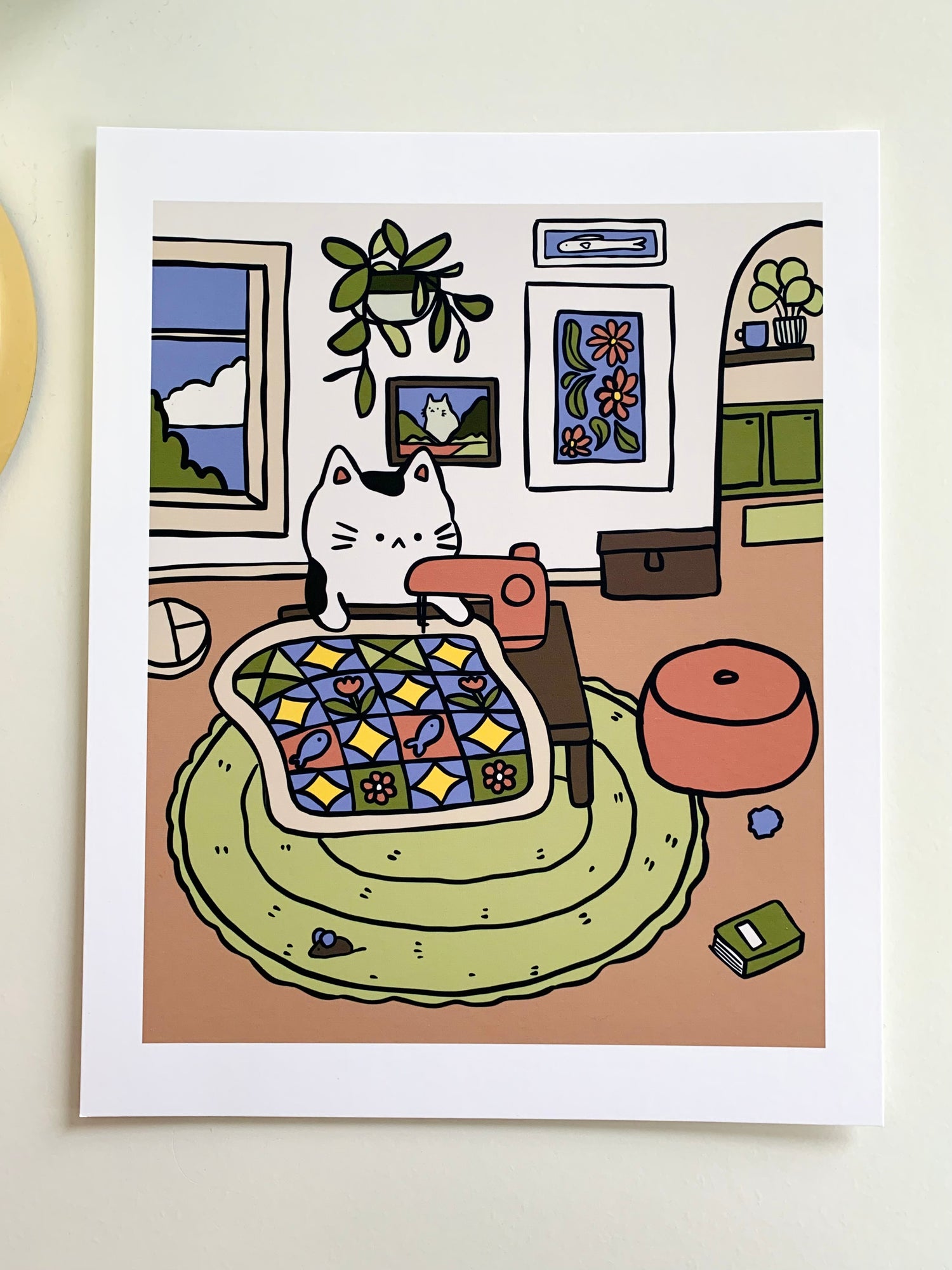 This art piece was printed on a high quality thick and matte photo paper for vibrant and smooth results and is a standard 8 x 10 inches big. Pairs super well with the knitting cat home scene as well! <3
